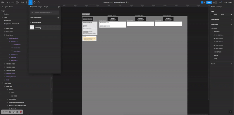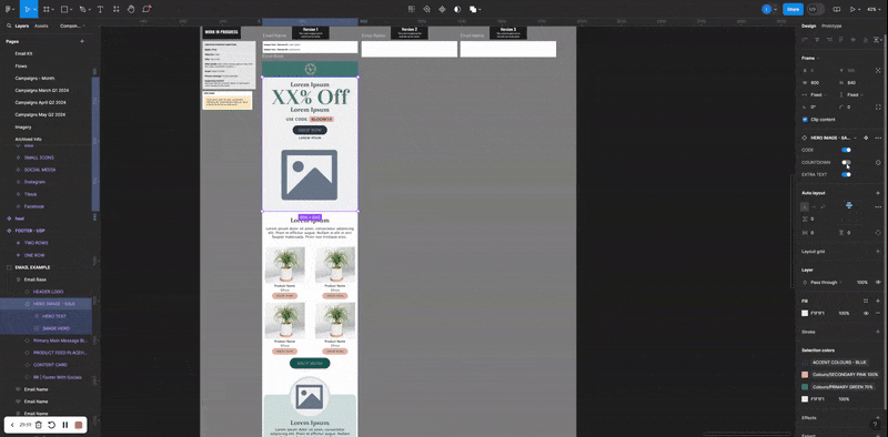 Email blocks are personalized by the designer and are then ready for use by the copywriting team. As shown in the image, the blocks have several variations which can be toggled on and off. This setup enables someone with minimal Figma knowledge to quickly modify items to suit their needs.